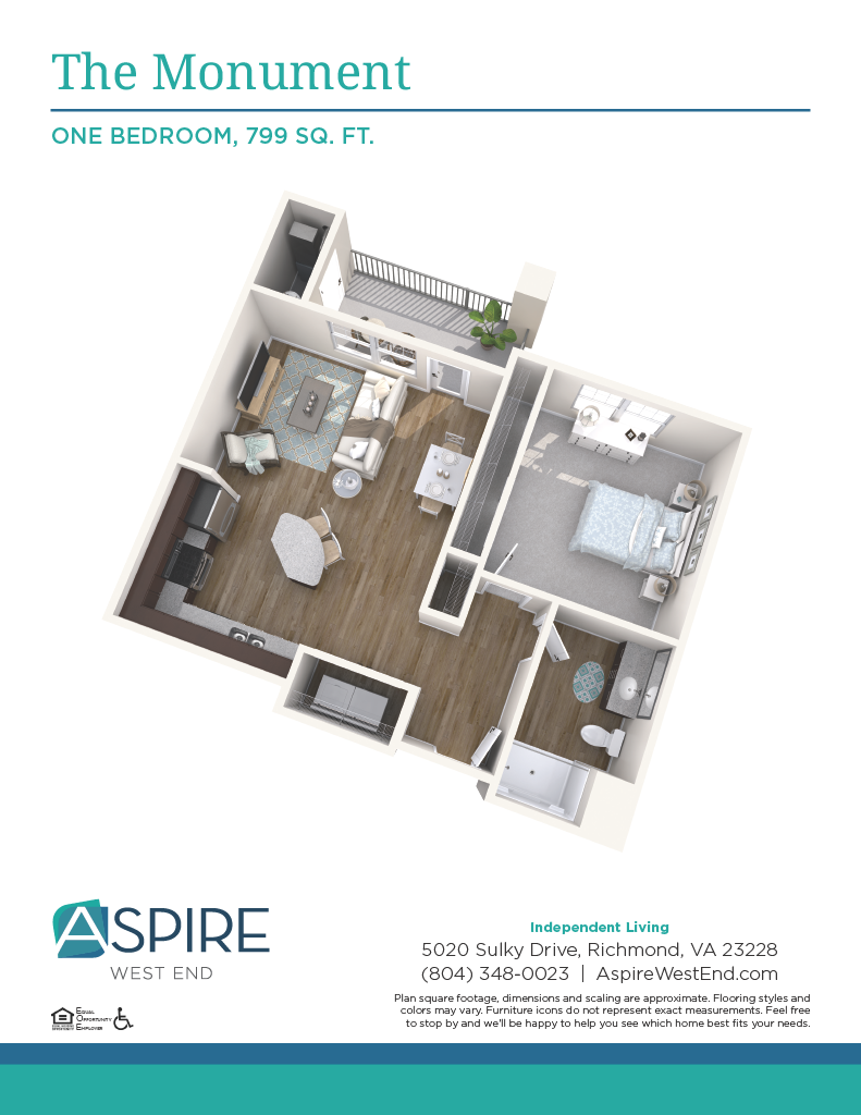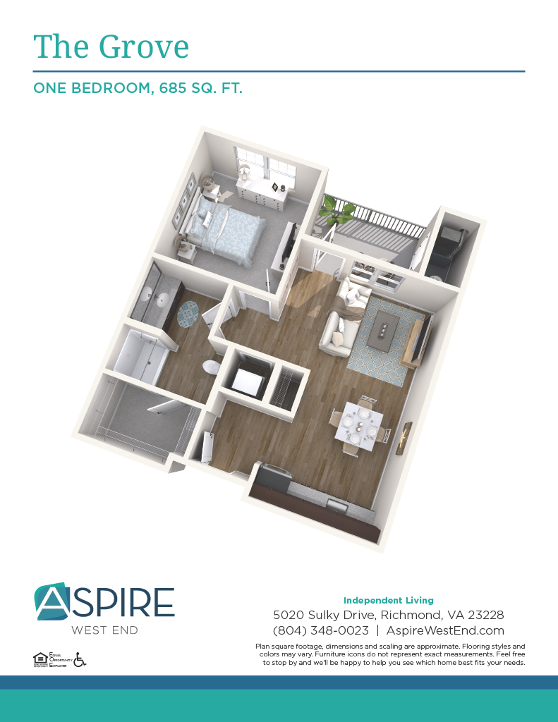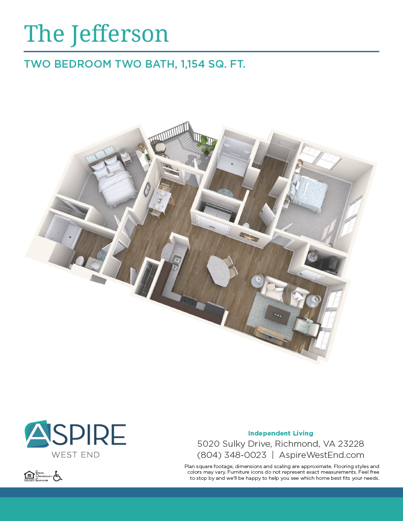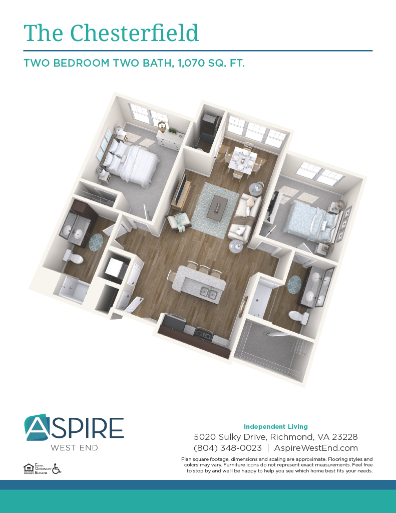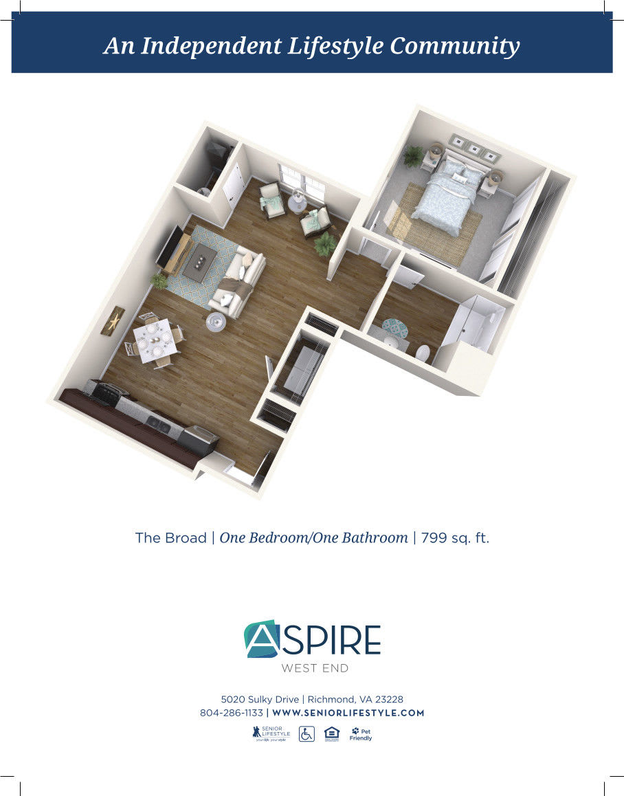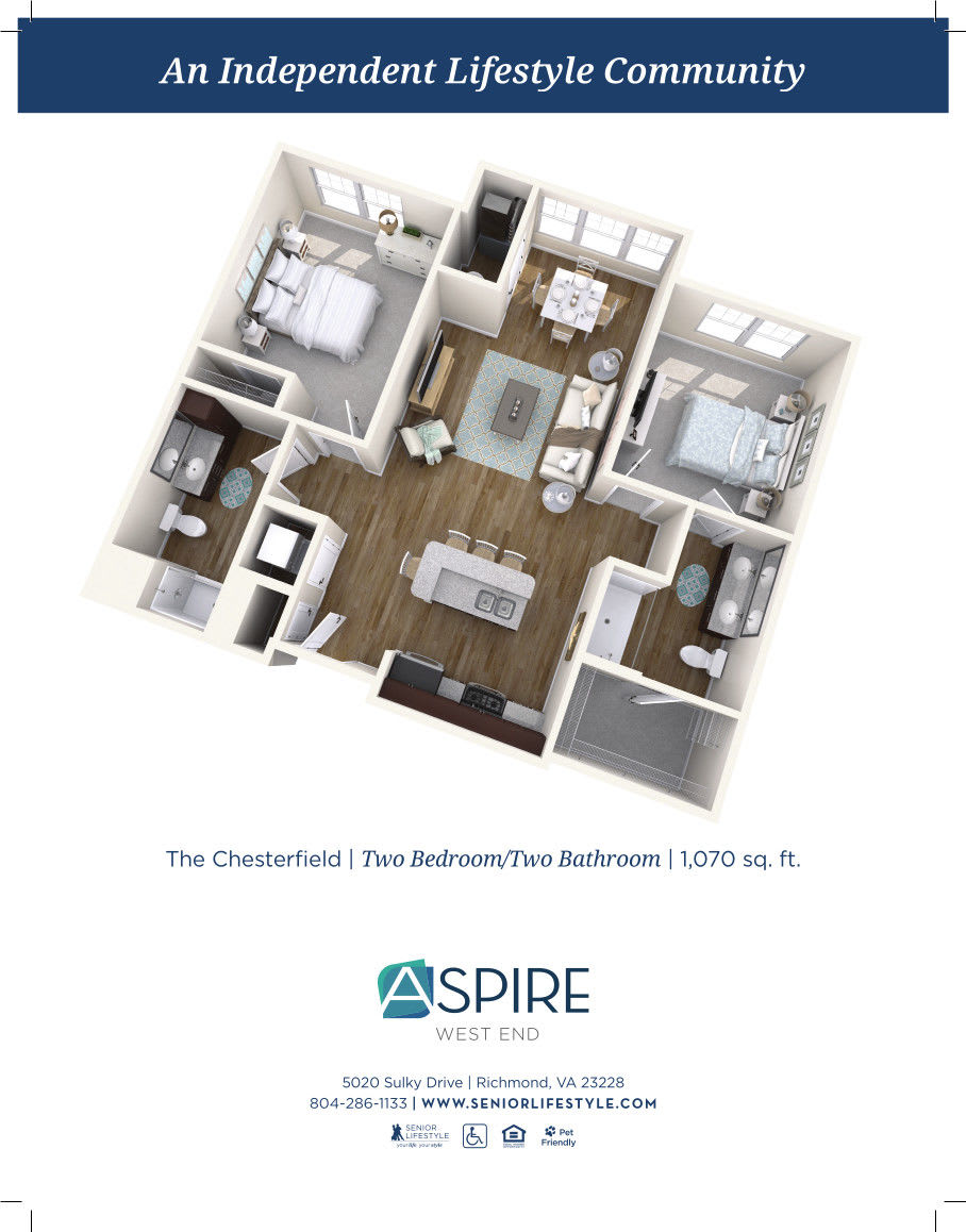 Enjoy carefree living at Aspire at West End. Our 55+ luxury senior living community in Richmond, Virginia, was built with you and your lifestyle in mind. In addition to spacious layouts and open-concept interiors, each of our pet-friendly apartment homes features charming accents and bright, versatile finishes. Choose to call our luxe community home today, and reside in a space that provides you with a beautiful, blank canvas for you to fill with your prized possessions and unique decorative flair.